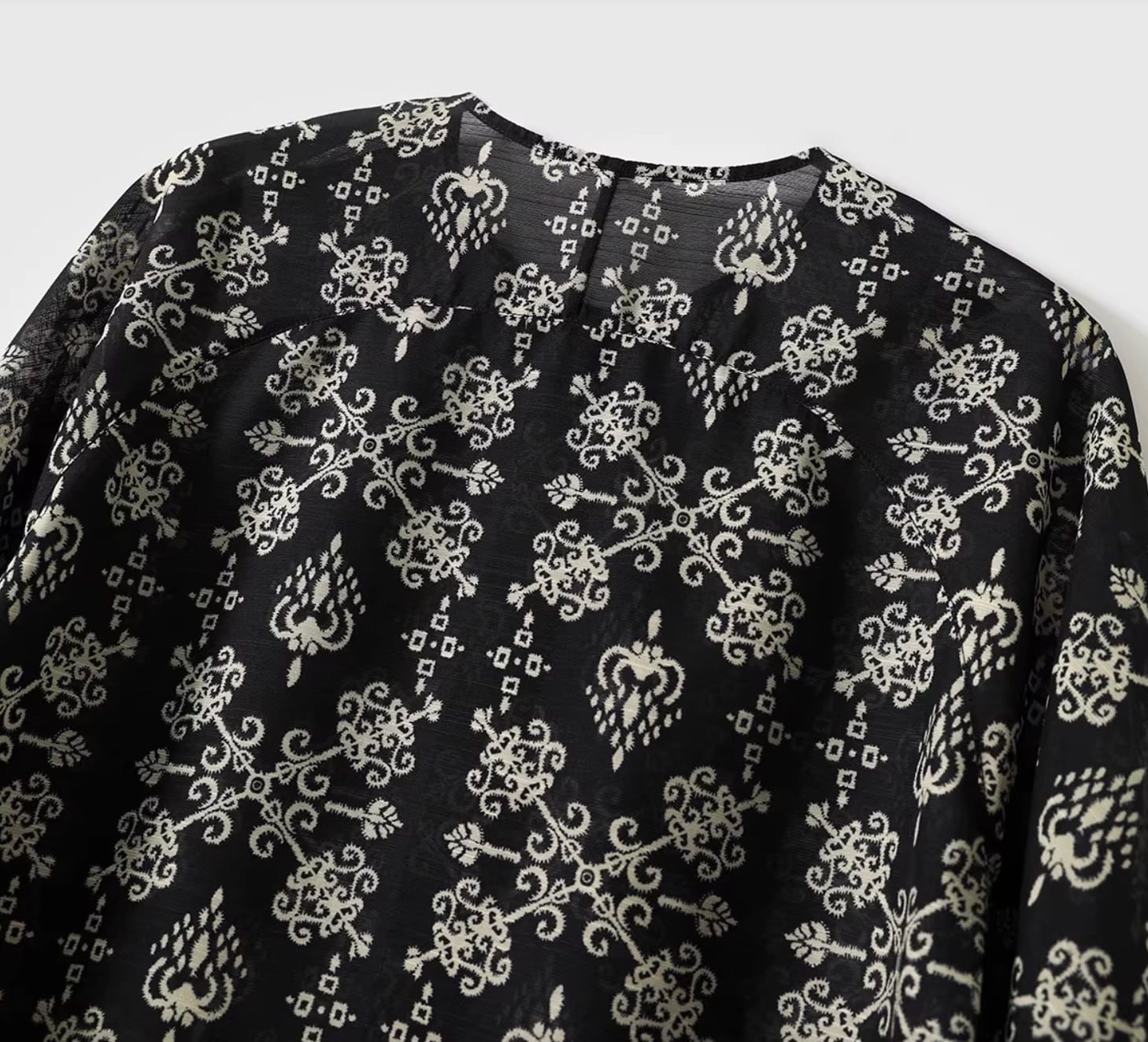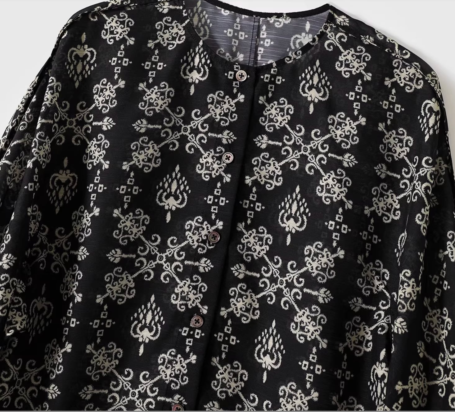 長袖 ノーカラー 総柄 ブラウス 1 /T-027