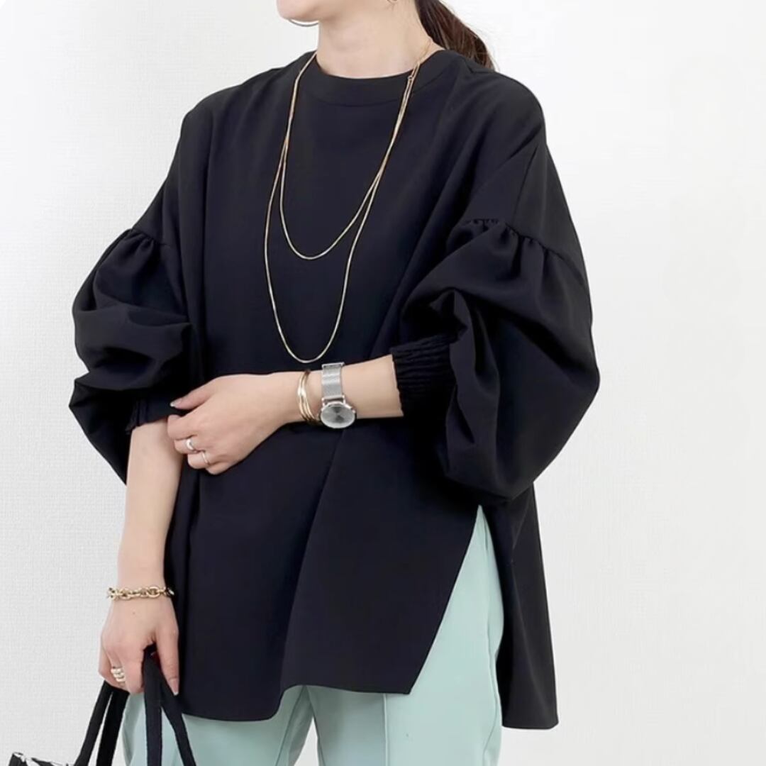 トレンドのランタンスリーブデザインが印象的な長袖シャツ。前後どちらでも着用できる2WAY仕様で、気分やスタイルに合わせたコーディネートが楽しめます。ヒップ丈なので、様々なボトムスと合わせやすく、レイヤードスタイルを引き立てる一枚です。女性らしいシルエットを演出し、カジュアルからきれいめまで幅広く活躍する万能アイテムです。
