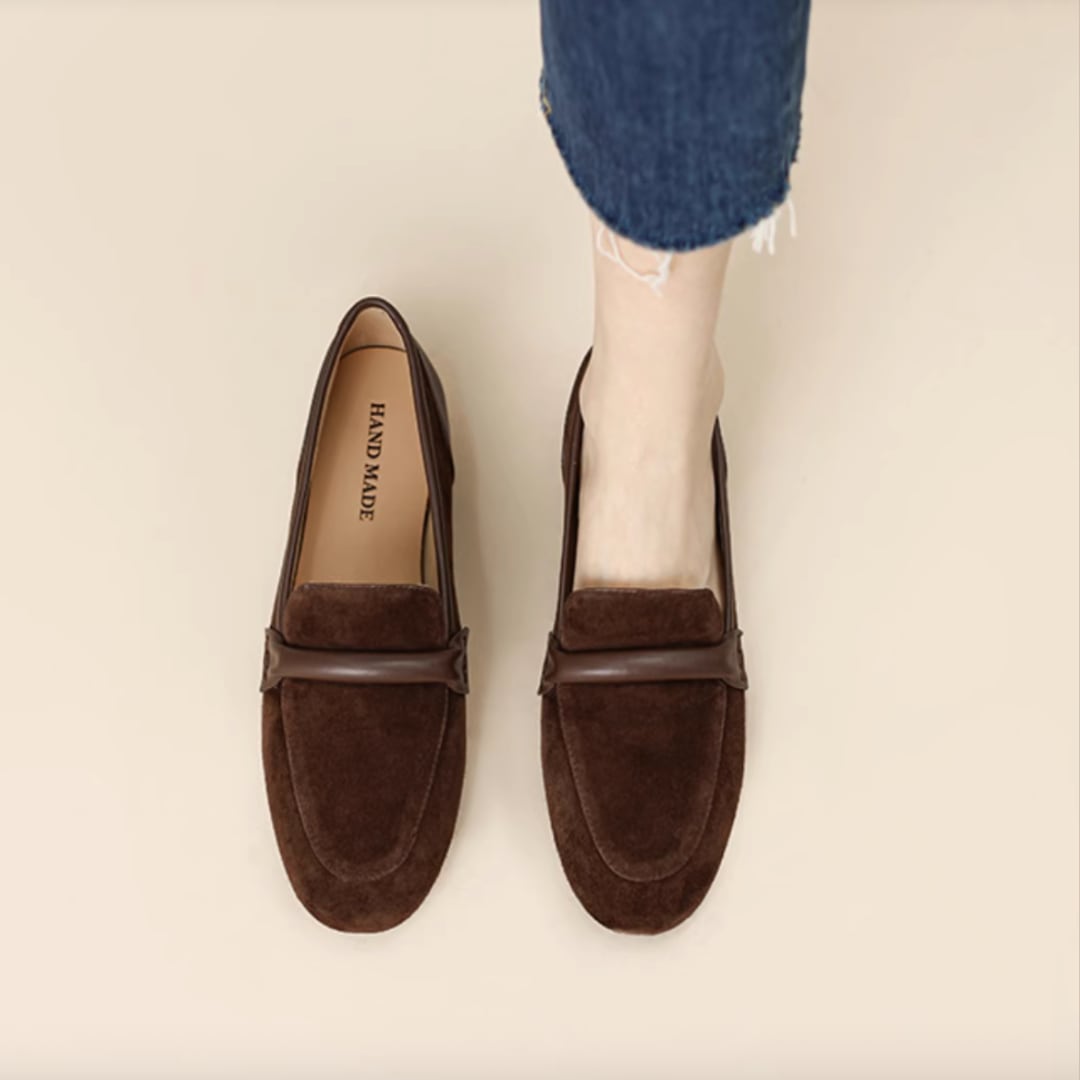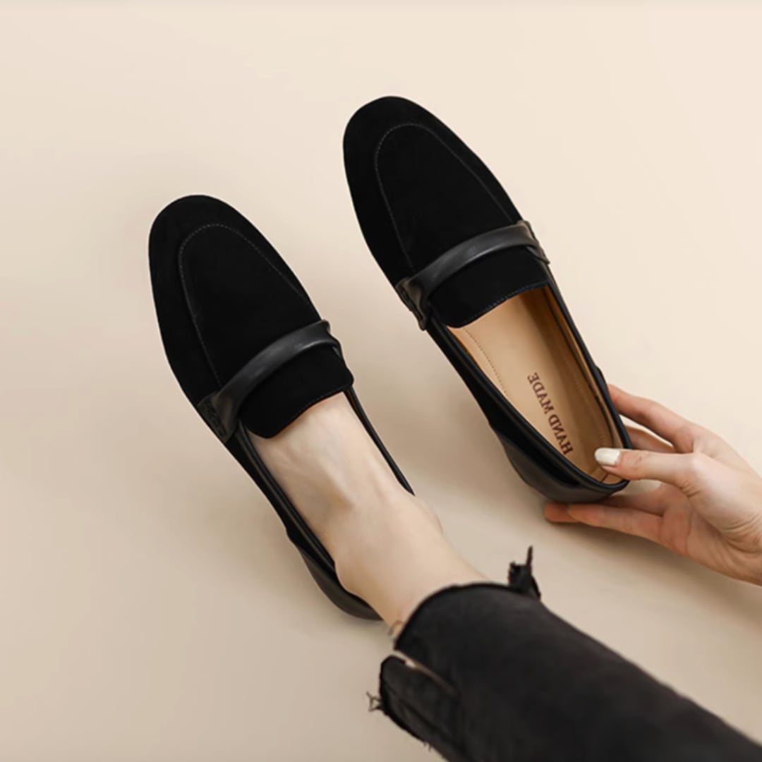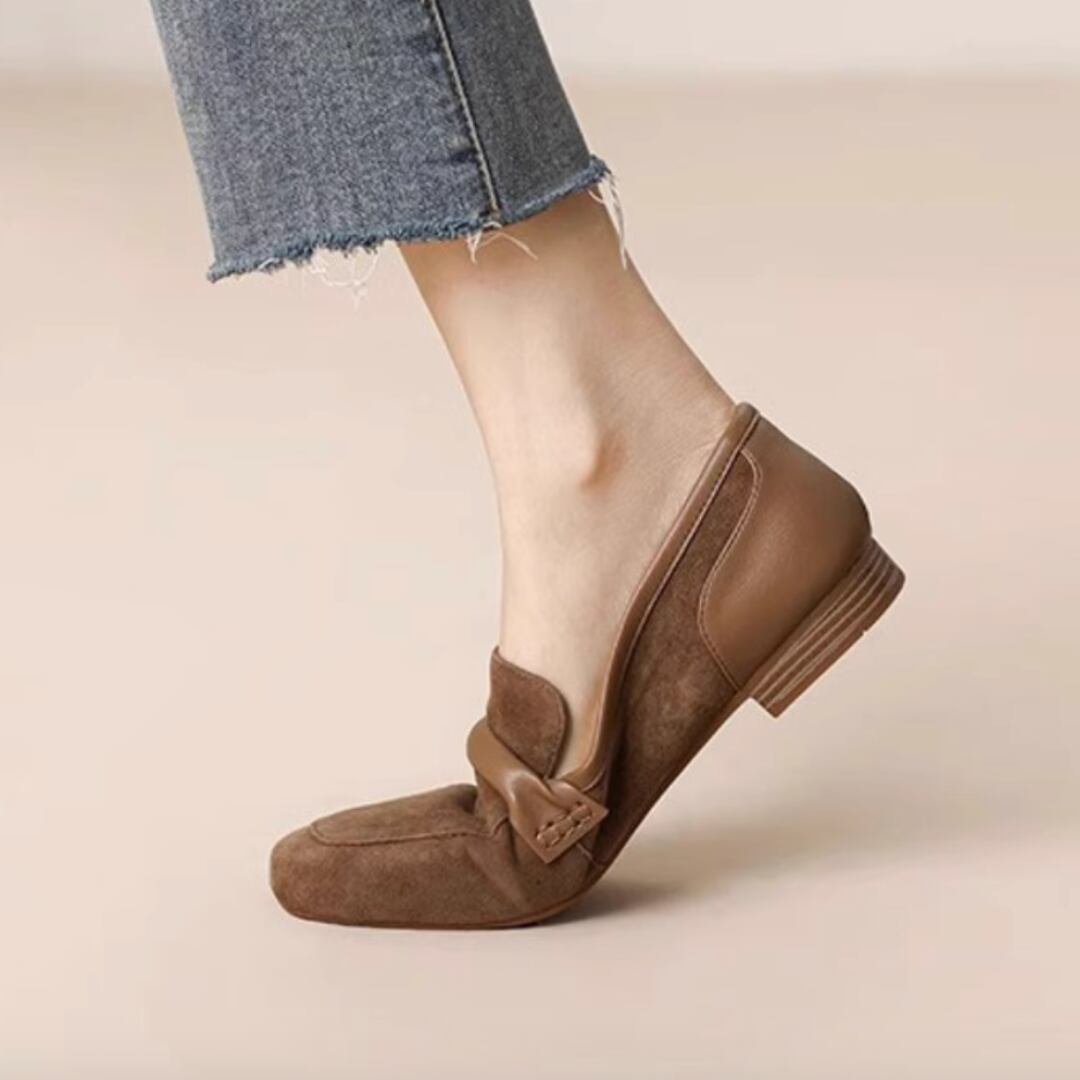 すっきりとしたスクエアトゥが、洗練された印象を与えるフラットシューズ。カジュアルながらも上品な雰囲気を演出し、普段使いからオフィススタイルまで幅広く活躍します。